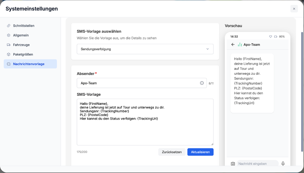 Die SMS-Vorlage kann angepasst werden (z. B. Absender-ID und Nachrichtentext). Dabei gelten technische Limits für die Absenderadresse und die Nachricht (z. B. Zeichenbegrenzung). Bestimmte Platzhalter sollten nicht entfernt werden, wenn sie für Tracking-Nummer oder Postleitzahl benötigt werden.