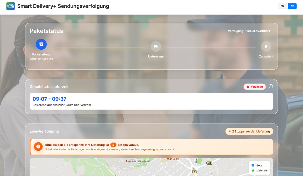 Über den Link kann der Kunde den Status verfolgen und - wenn seine Zustellung ansteht - die Position des Fahrers auf der Karte sehen. Dies verbessert Transparenz und Servicequalität des Botendienstes deutlich.