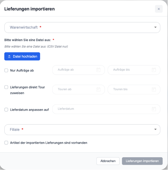 Beim Import werden Warenwirtschaft, Datei und Zeitraum bzw. Aufträge ausgewählt. Anschließend werden die Lieferungen einer Filiale zugewiesen. Optional kann die Verfügbarkeit von Artikeln als vorhanden markiert werden.