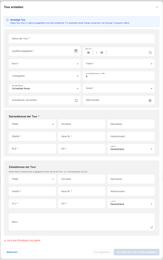 Bei der Erstellung können u. a. fester Bote (optional), Filiale (auch Mehrfachauswahl), Aufenthaltsdauer des Fahrers, Routing-Praeferenz (schnellste/kürzeste Route), Tourfarbe, Startadresse (Filiale oder manuell) und Notizen gesetzt werden.