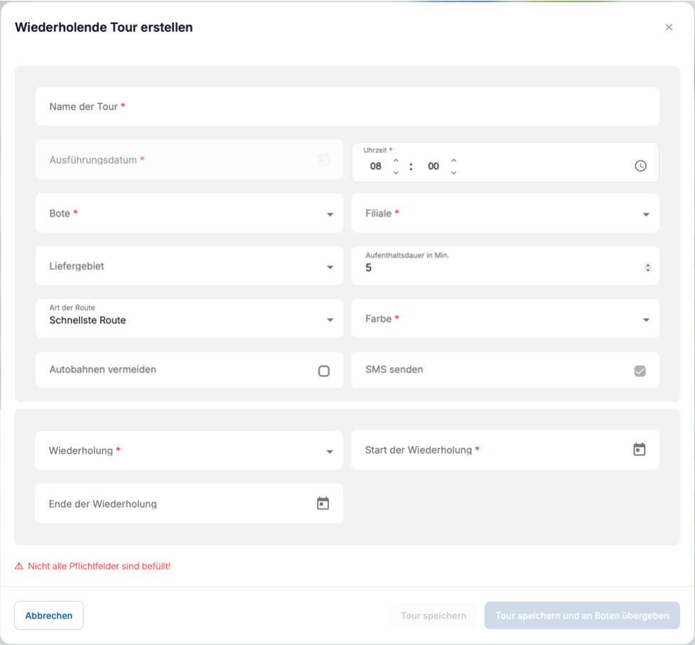 Für regelmäßige Touren empfiehlt sich die Nutzung wiederholender Touren über das Drei-Punkte-Menü und den Tourenplan. Pflichtfelder sind markiert.