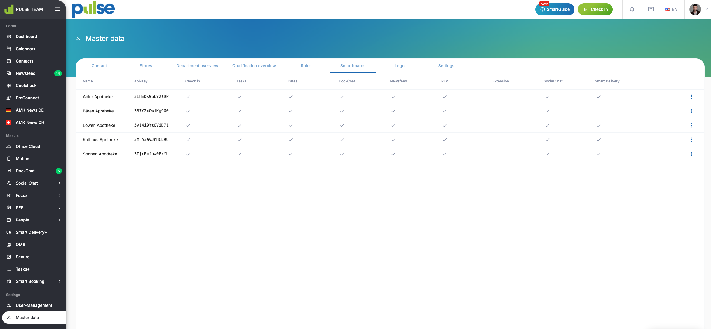 Sie können den API-Key im PULSE Portal unter Stammdaten → Smartboards nachvollziehen.