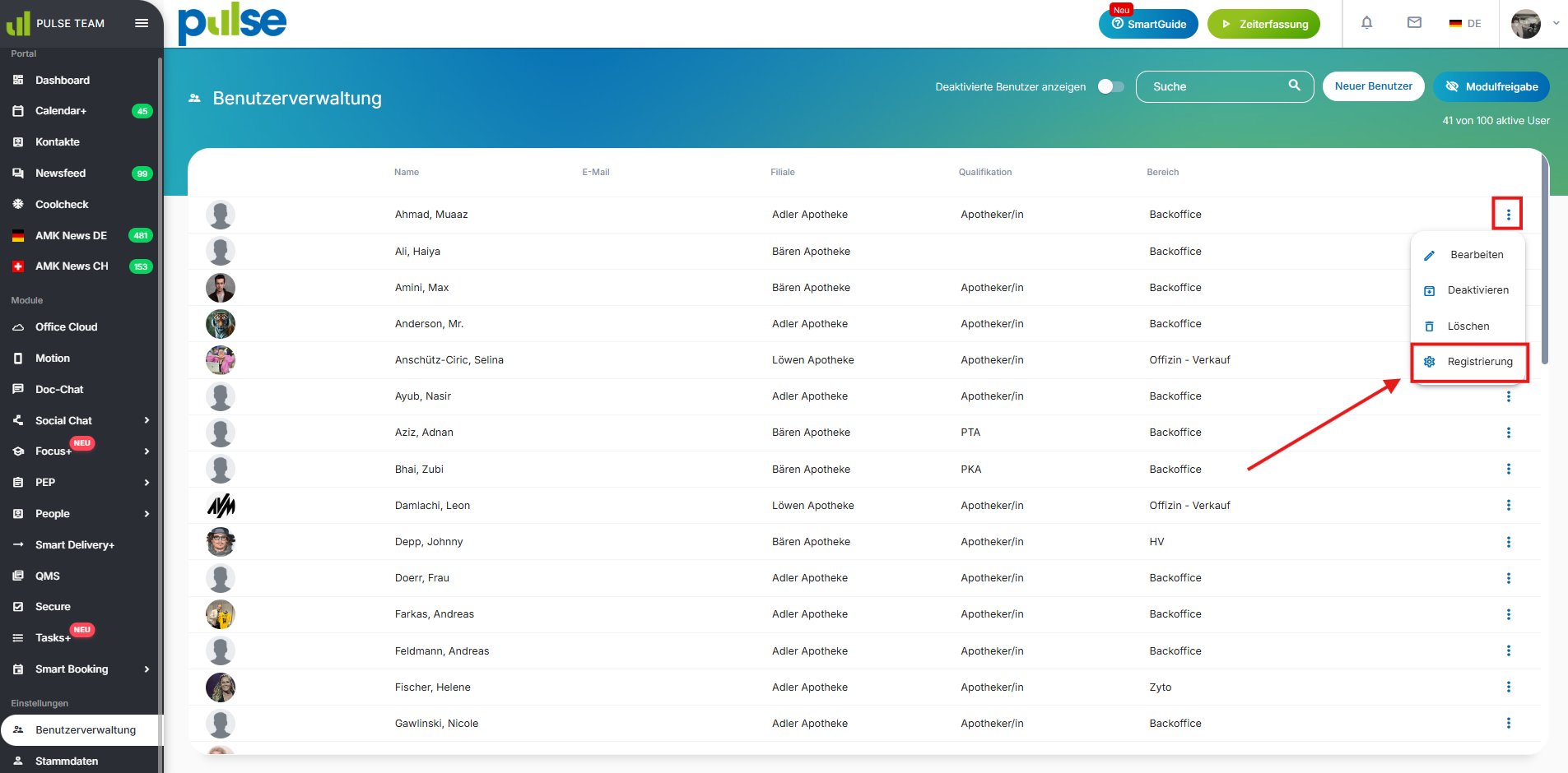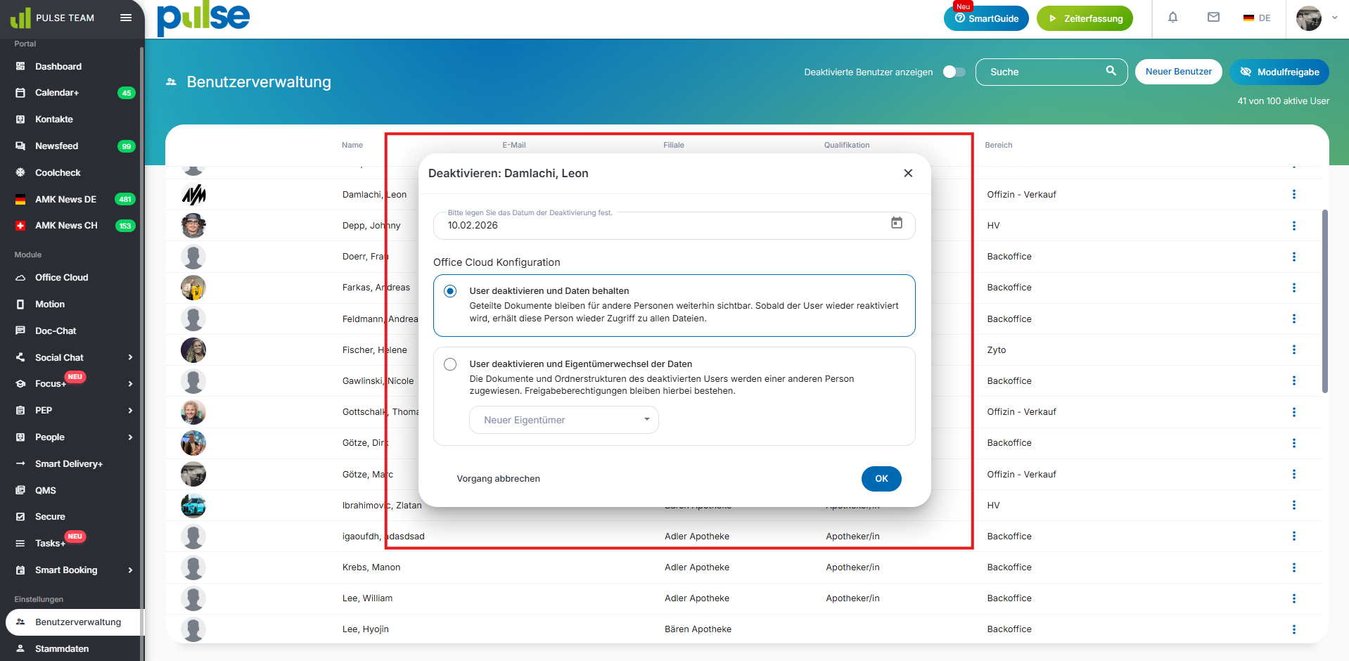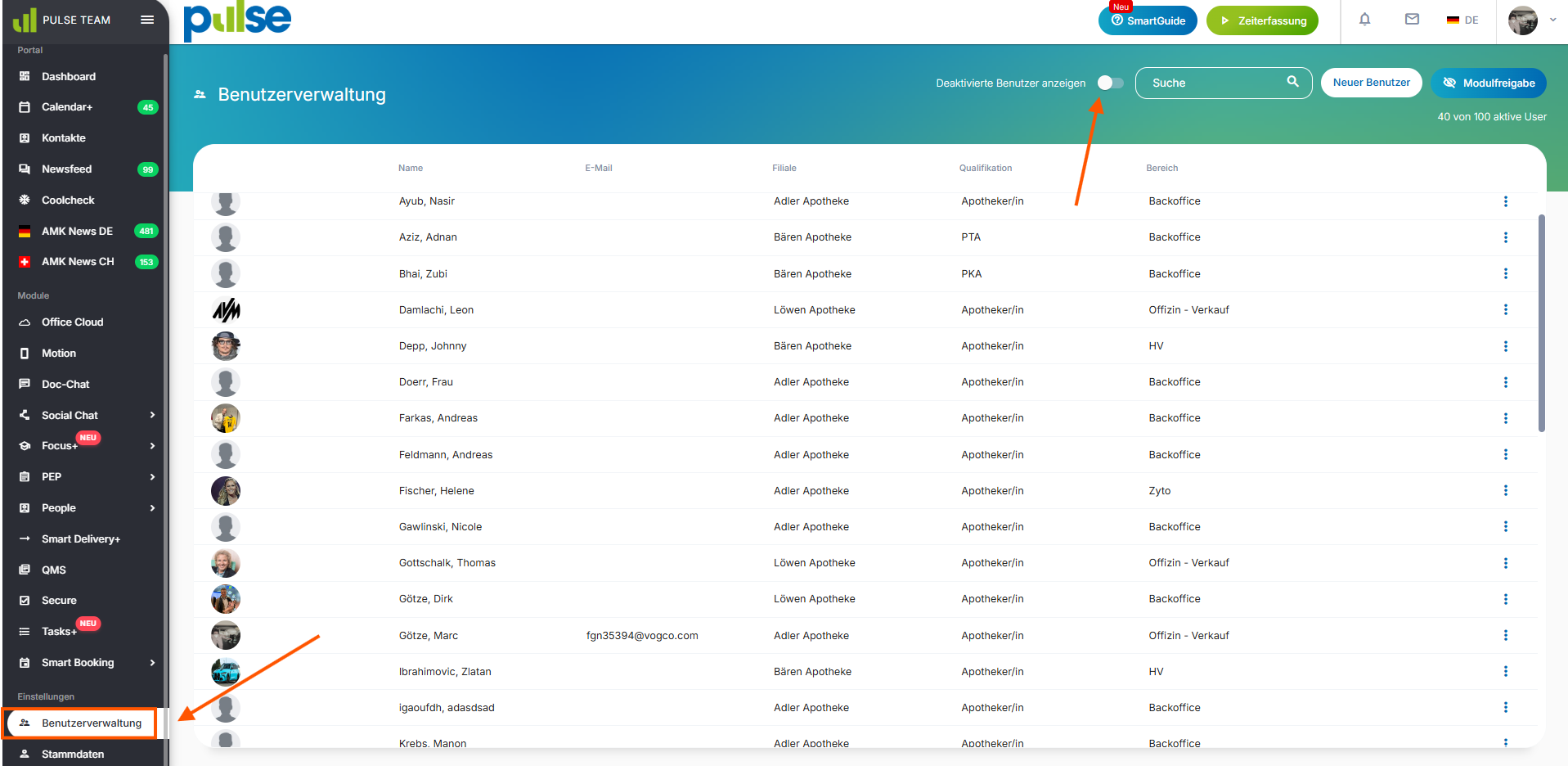 Mit einem Klick auf „Modulfreigabe“ (oben rechts) können Module gezielt für einzelne oder mehrere Mitarbeitende ein- oder ausgeblendet werden.