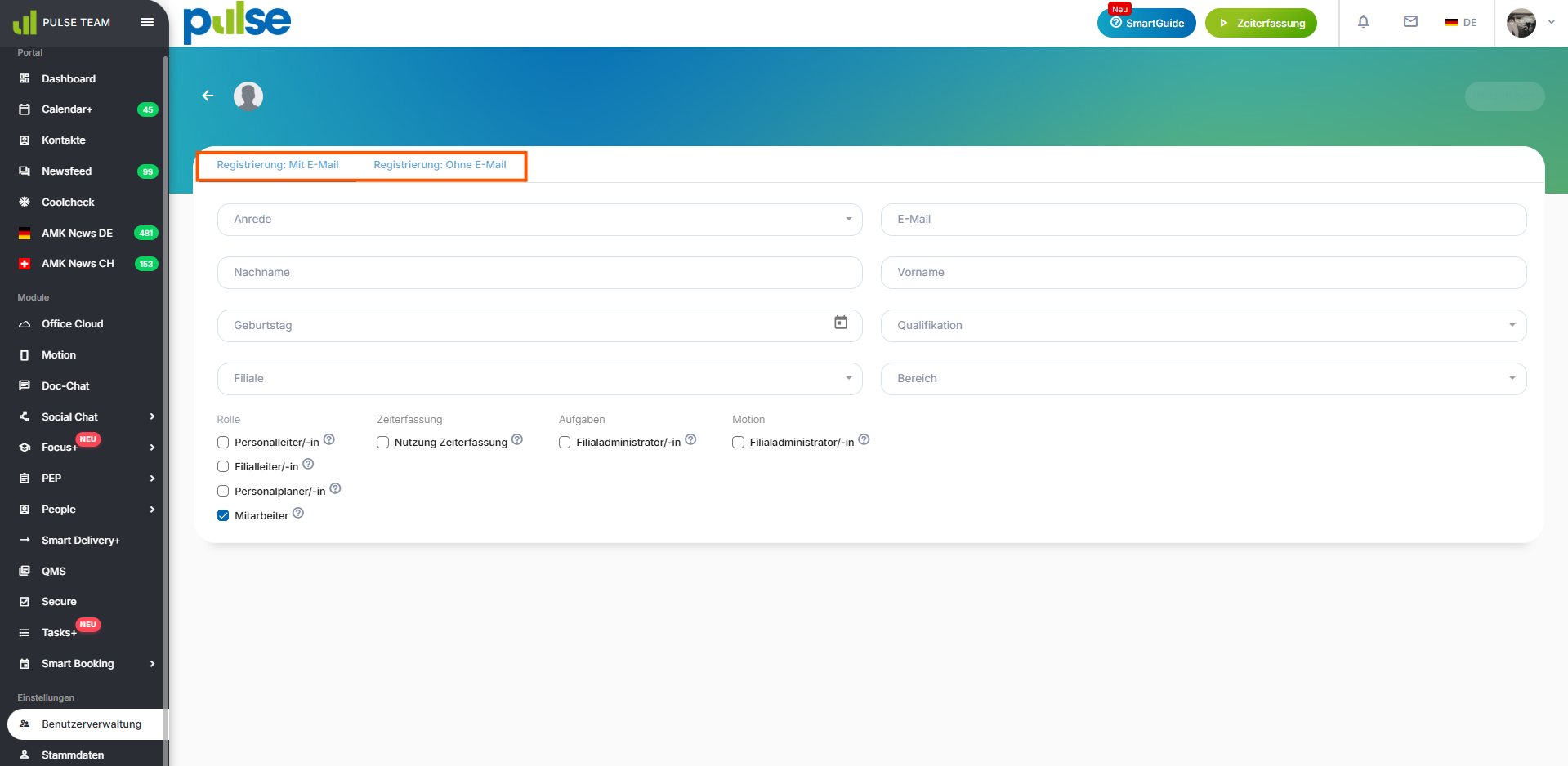 Die Rolle bestimmt in der PULSE Software, welche Bereiche des Systems eine Person sehen und welche Funktionen sie bearbeiten darf.