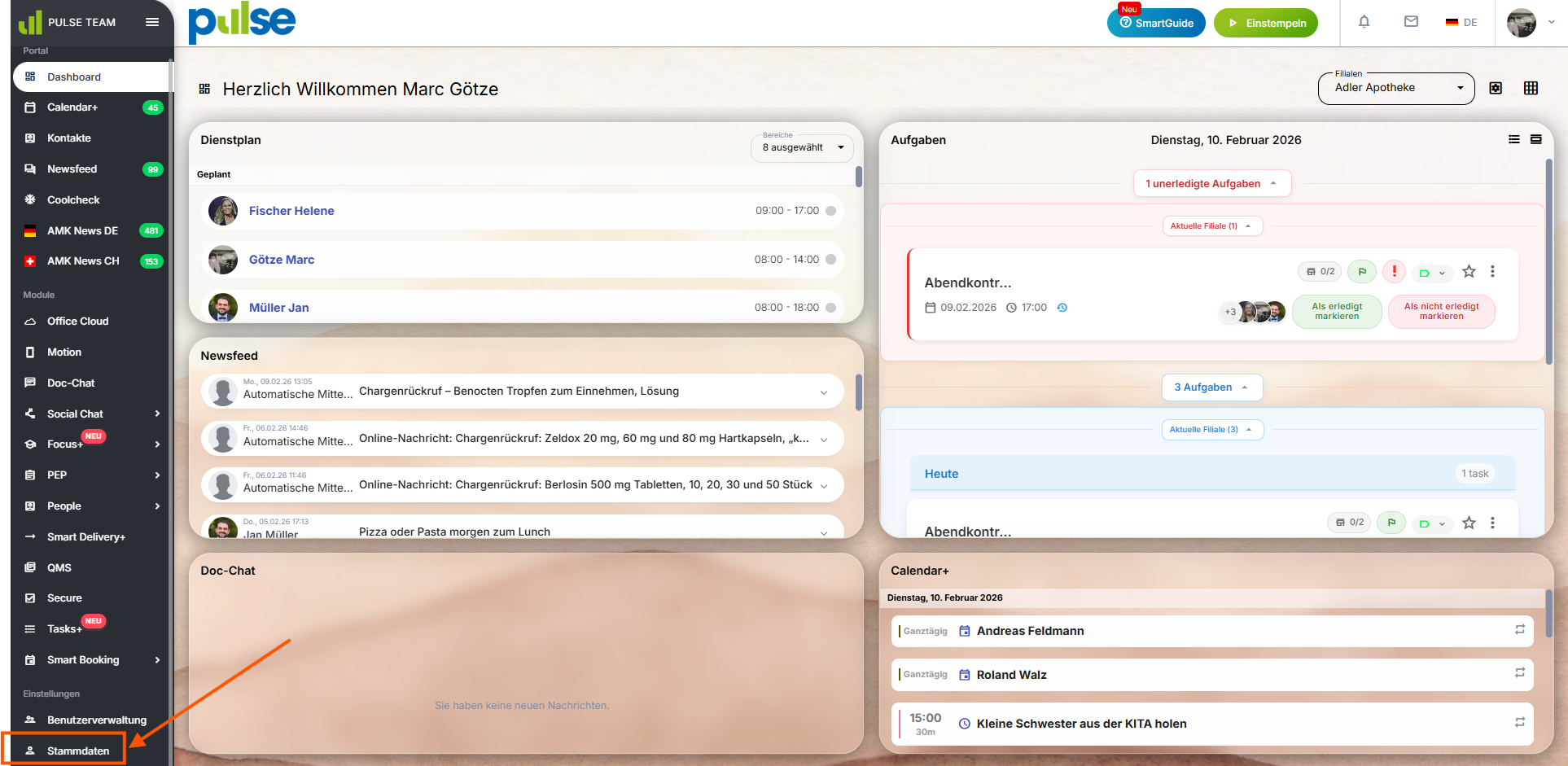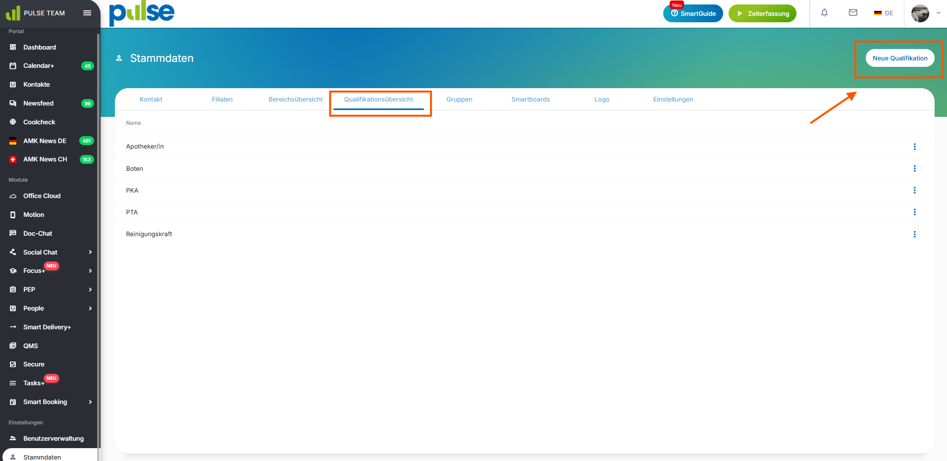 Bevor Mitarbeitende im System angelegt werden, erfolgt die grundlegende Einrichtung der Stammdaten. Diese bilden das Fundament für alle weiteren Prozesse der PULSE Team Software.