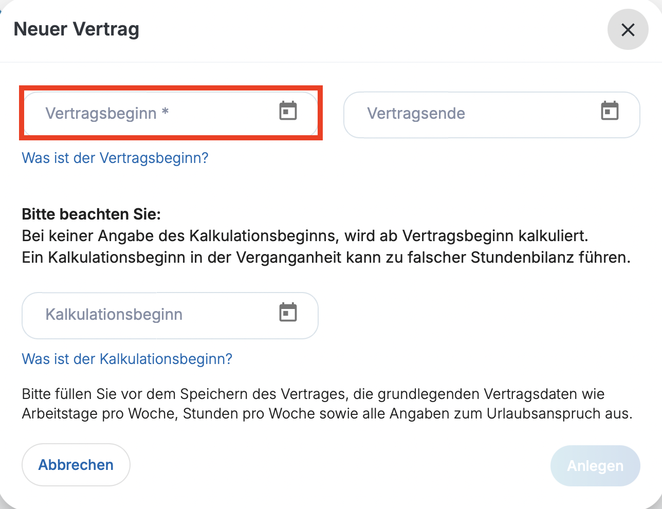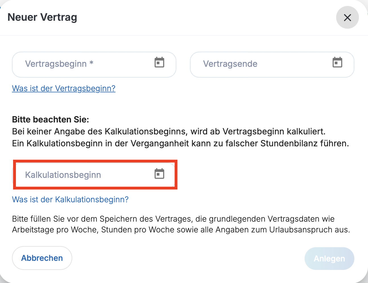 Der Kalkulationsbeginn legt fest, ab welchem Datum das System rechnet.