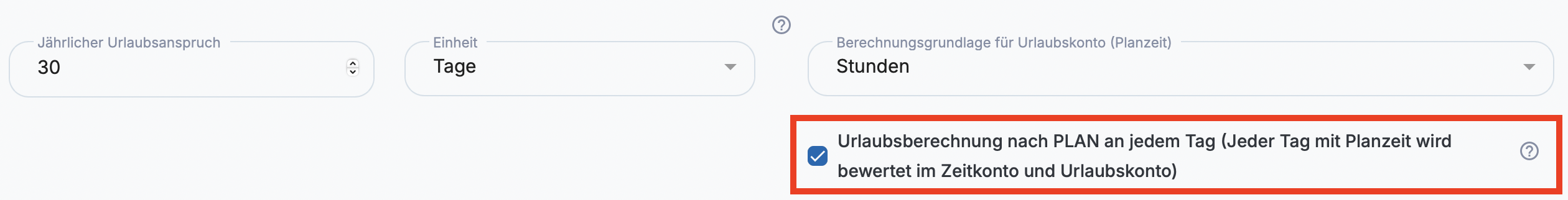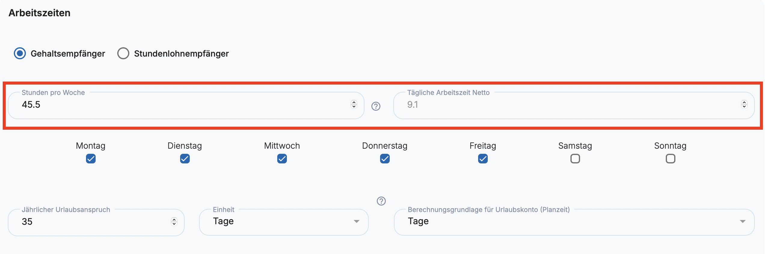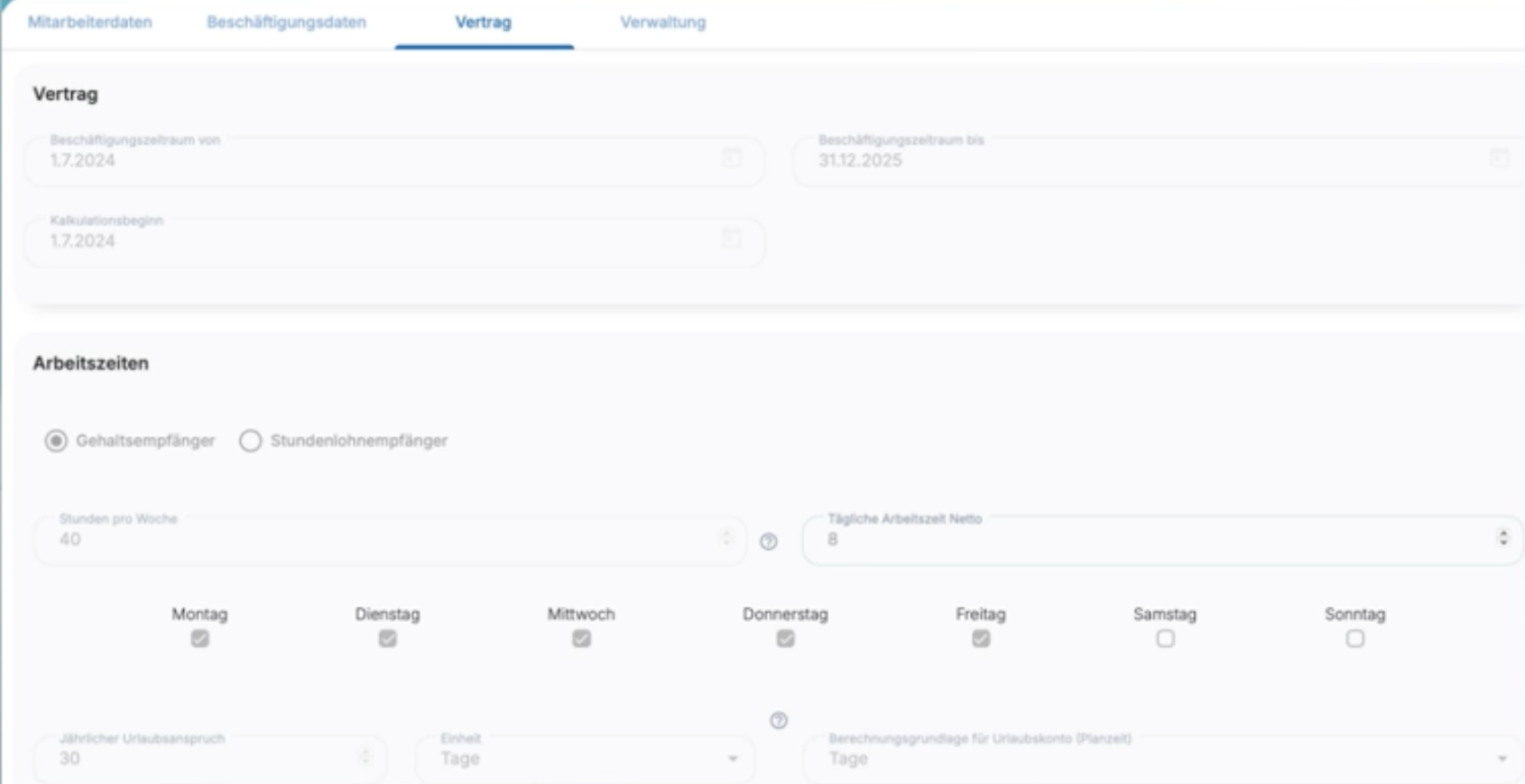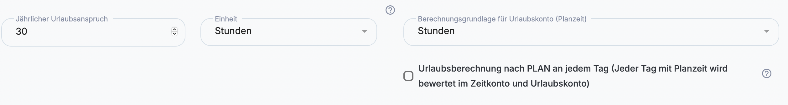 Diese Einstellungen bilden die Grundlage für Zeitkonto, Abwesenheiten und Dienstplanung.