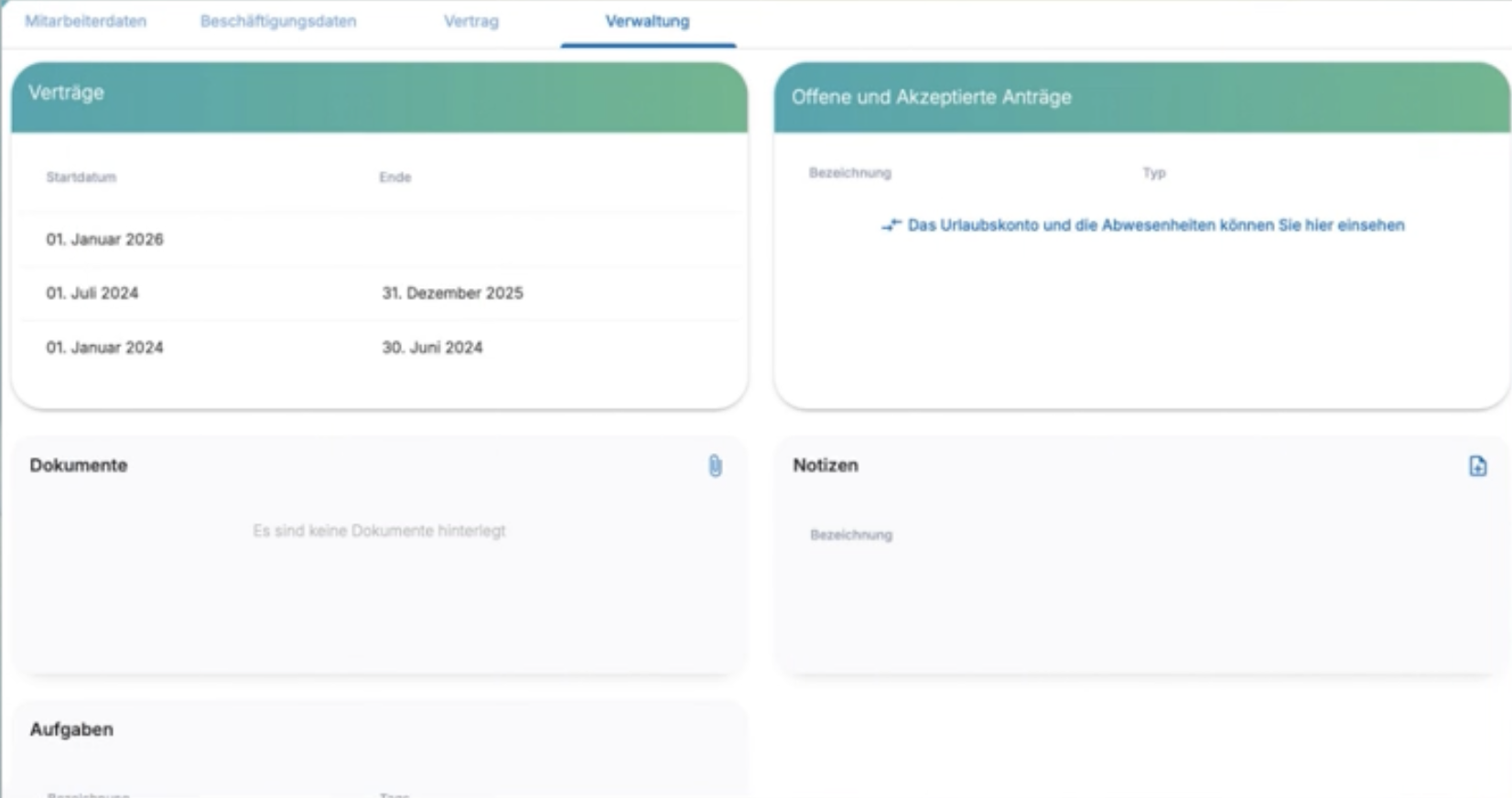 - Verwaltung (Zeitkonto, Dokumente, Notizen)