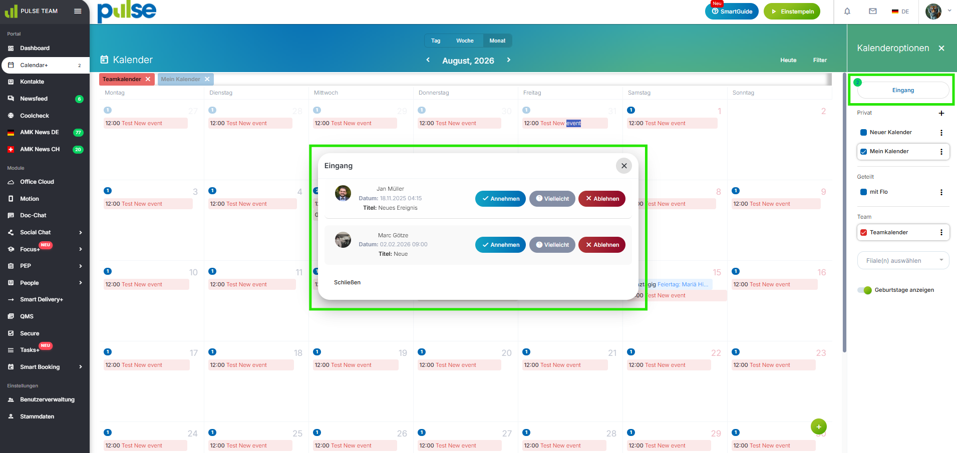 Der „Eingang“-Button auf der rechten Seite des Bildschirms zeigt Ihnen eingehende Kalenderfreigaben von Kolleginnen und Kollegen. Wenn Sie zu deren Kalender eingeladen wurden, können Sie die Freigabe annehmen und entsprechend der vergebenen Zugriffsrechte den Kalender einsehen, bearbeiten oder verwalten.