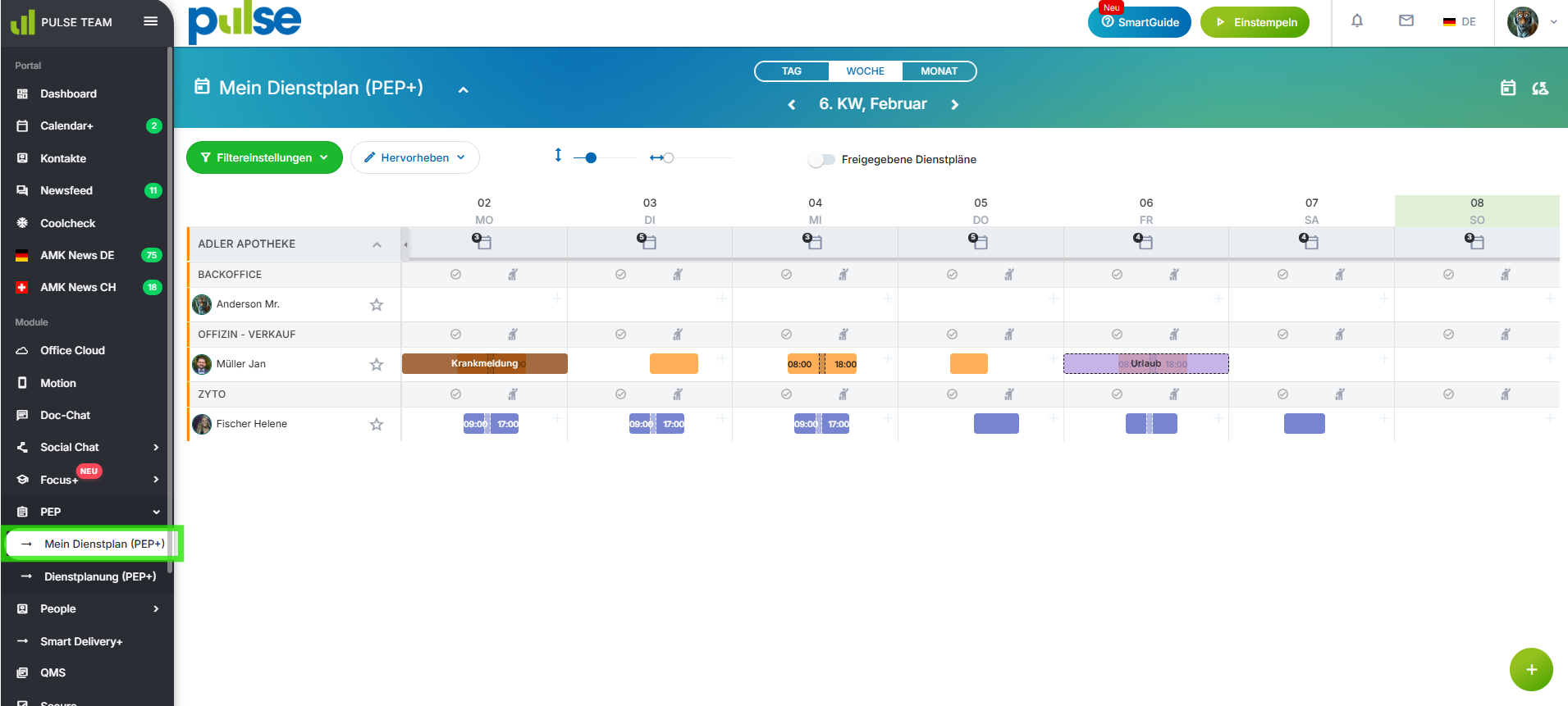 Im „Mein Dienstplan“-Bereich sehen Mitarbeitende nur ihren eigenen Dienstplan, der alle zugewiesenen Schichten, Pausen und Abwesenheiten enthält. Sie können den Dienstplan mit einem Filter anpassen, um auch die Dienstpläne von Kollegen zu sehen, jedoch keine Änderungen vornehmen. Geplanter Urlaub der Kollegen ist nicht sichtbar.
