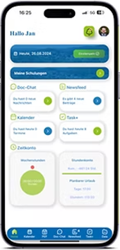 Der HOME-Bildschirm der PULSE Team App bietet eine übersichtliche Darstellung aller wichtigen Informationen und Funktionen, die Sie im Arbeitsalltag benötigen.
