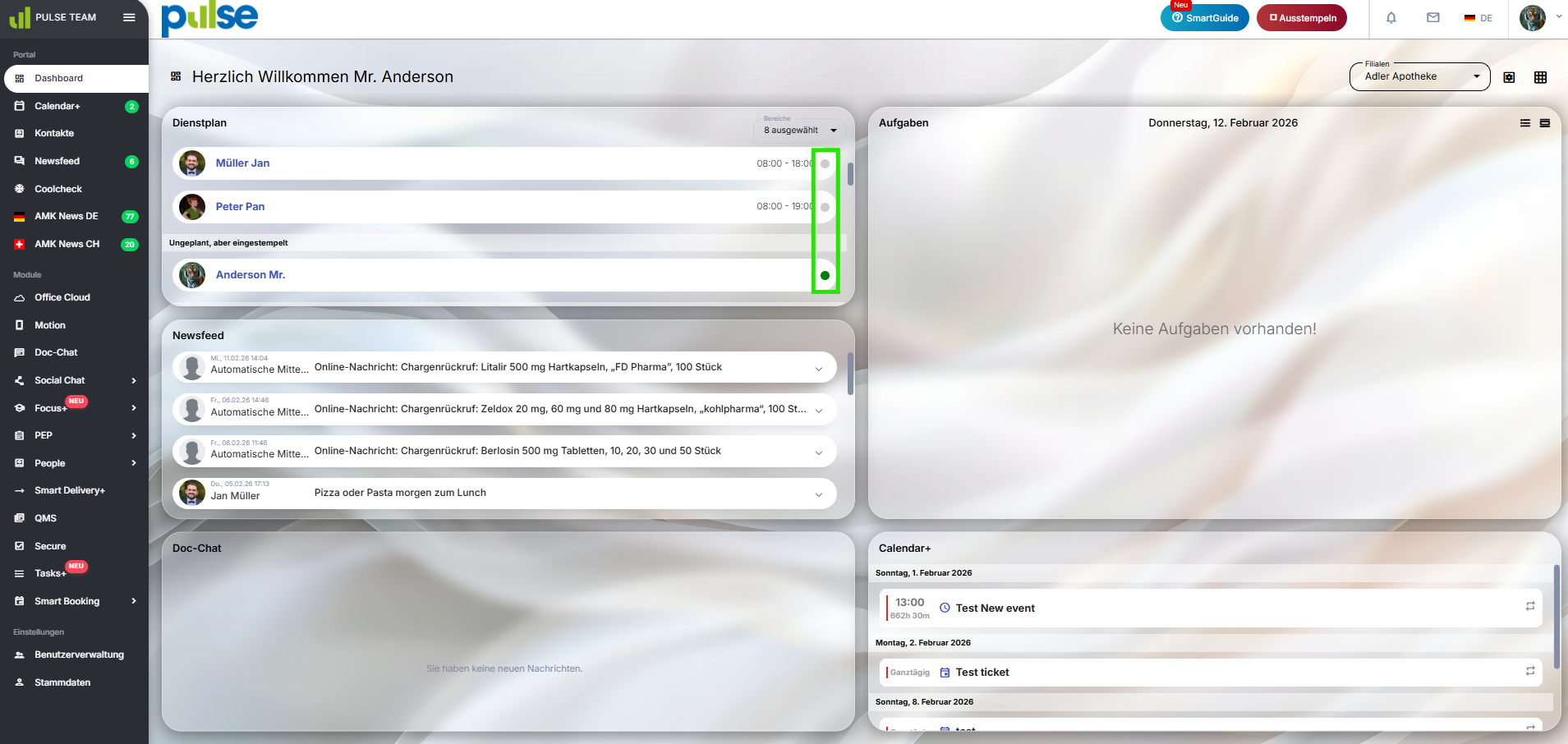 Sie können den Status Ihrer Mitarbeitenden direkt am grünen Symbol in der Dienstplan-Kachel erkennen. Ein grünes Kreis-Symbol zeigt an, dass der Mitarbeiter bereits eingestempelt ist und somit seine Arbeitszeit begonnen hat.