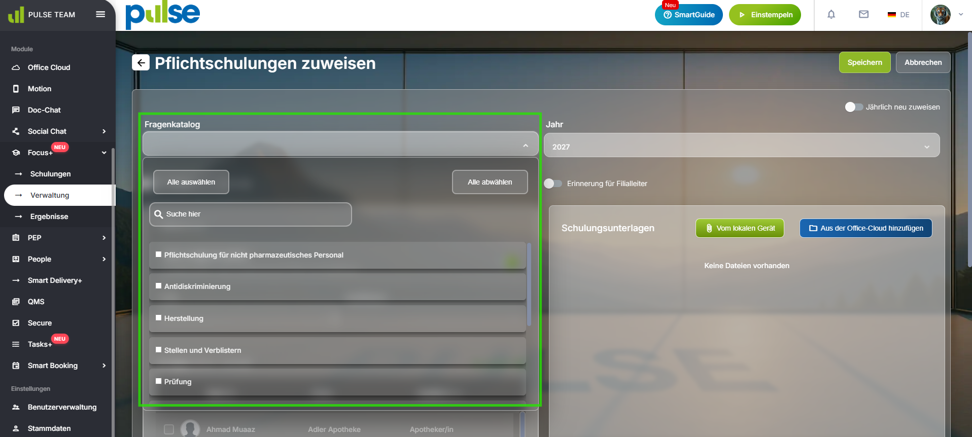 3. Wählen Sie alle links oben alle Fragenkataloge aus, die die Mitarbeitenden absolvieren sollen.