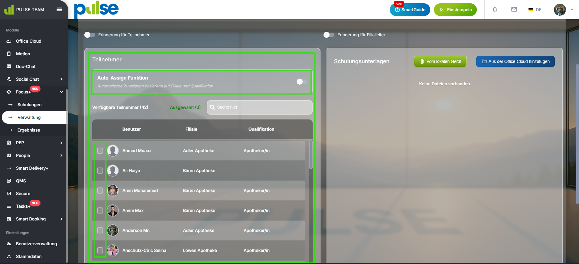 Wenn Sie Auto-Assign aktivieren, können Sie die Teilnehmer automatisch über Auswahl der Filialen und Qualifikationen hinzufügen.