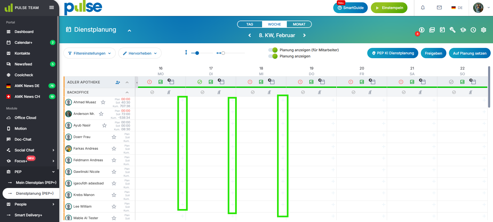 Um eine Schicht im Dienstplan zu erstellen, bewegen Sie den Mauszeiger über eines der Plussymbole, die in jeder Zeile für jeden Tag erscheinen. Alternativ können Sie auch im Dienstplanfeld die rechte Maustaste klicken.