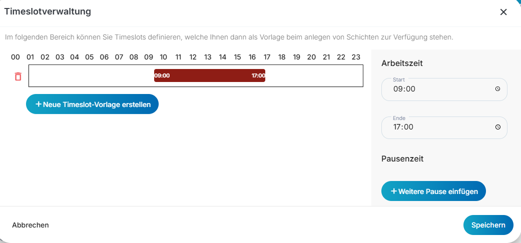 Mit einem Klick auf „Neue Timeslot-Vorlage erstellen“ öffnet sich ein neues Timeslot-Fenster. Auf der rechten Seite dieses Fensters haben Sie die Möglichkeit, die Start- und Endzeit des neuen Timeslots festzulegen. Zusätzlich können Sie, falls erforderlich, eine oder mehrere Pausen hinzufügen.