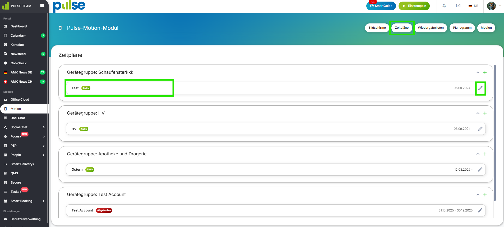 - Sie sehen eine Übersicht über aktive und abgelaufene Zeitpläne.
