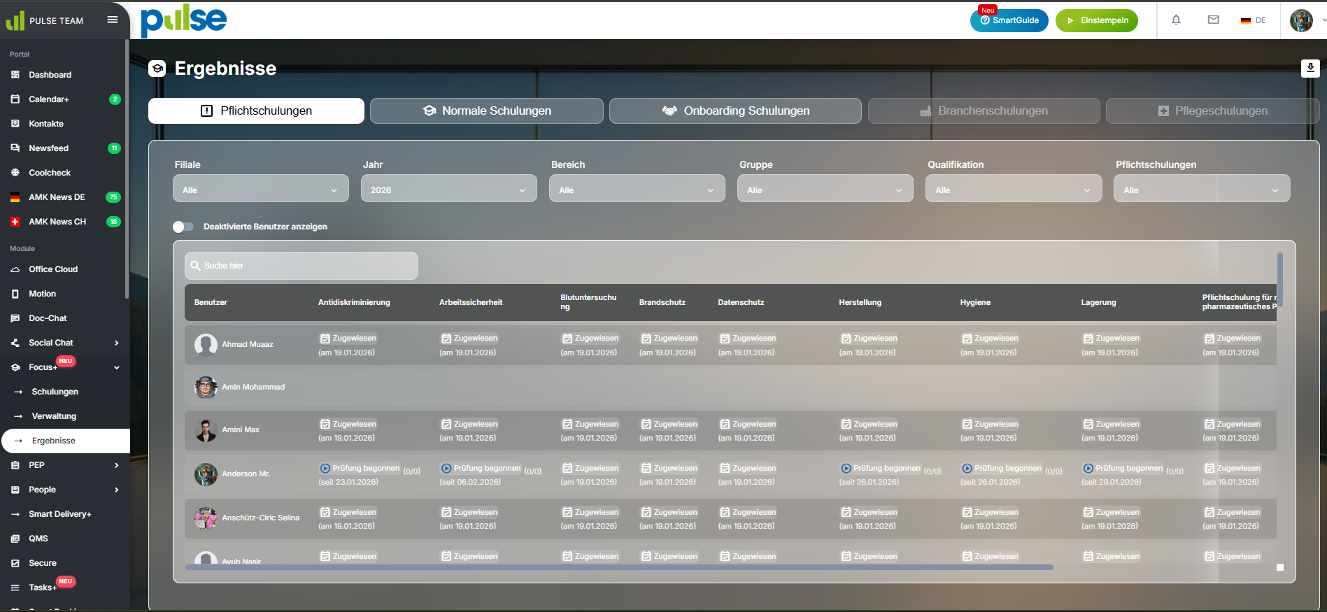 - Klicken Sie im Untermenü „Ergebnisse“ auf „Pflichtschulungen“ oder „Eigene Schulungen“ um zur globalen Übersicht zu gelangen. Hier sehen Sie die zuletzt zugewiesene Schulung samt Datum.