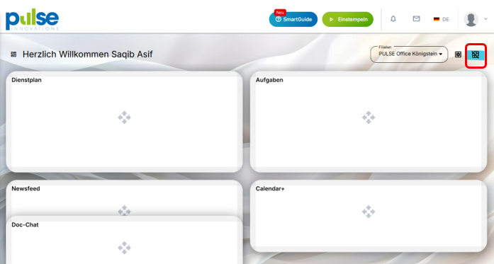 Oben rechts auf dem Dashboard finden Sie ein Gittersymbol . Damit können Sie die Module individuell anordnen und so Ihr Dashboard nach Ihren Bedürfnissen gestalten. So können Sie schneller auf die Informationen zugreifen, die für Sie am wichtigsten sind.