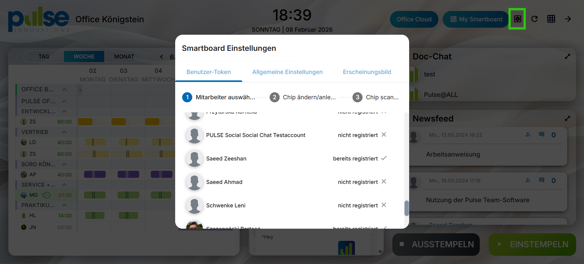 Sie können die RFID-Chips direkt am Smartboard den Mitarbeitern zuweisen. Hierzu drücken Sie auf das Einstellungssymbol oben rechts.