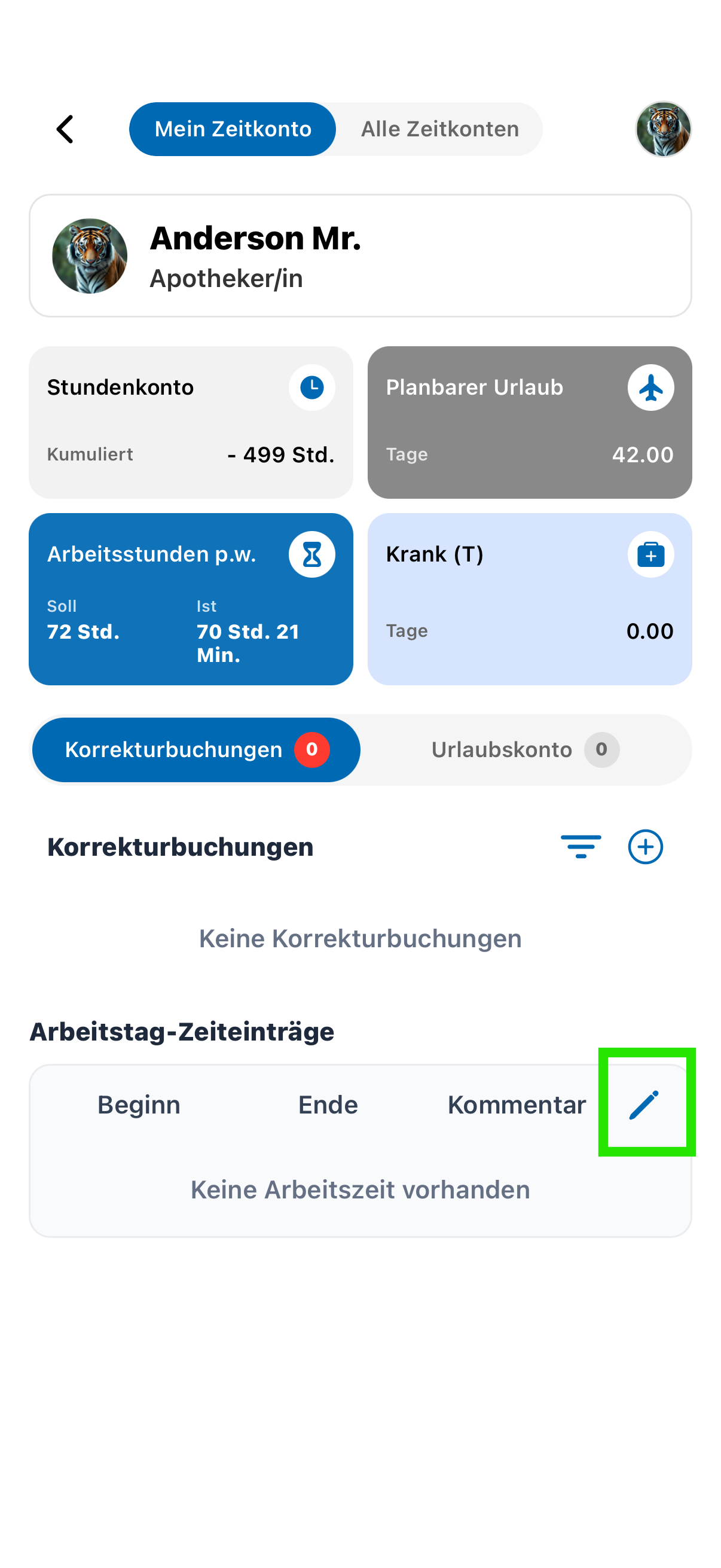 - Scrollen Sie nach unten zum Abschnitt „Arbeitstag-Zeit-Einträge“. Hier wird Ihre gestempelte Arbeitszeit angezeigt.