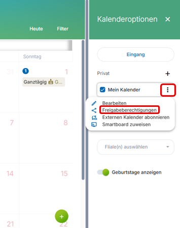 Klicken Sie neben dem Kalendertitel auf die drei Punkte. Dort haben Sie die Möglichkeit, Ihren Kalender mit Ihren Kollegen zu teilen.