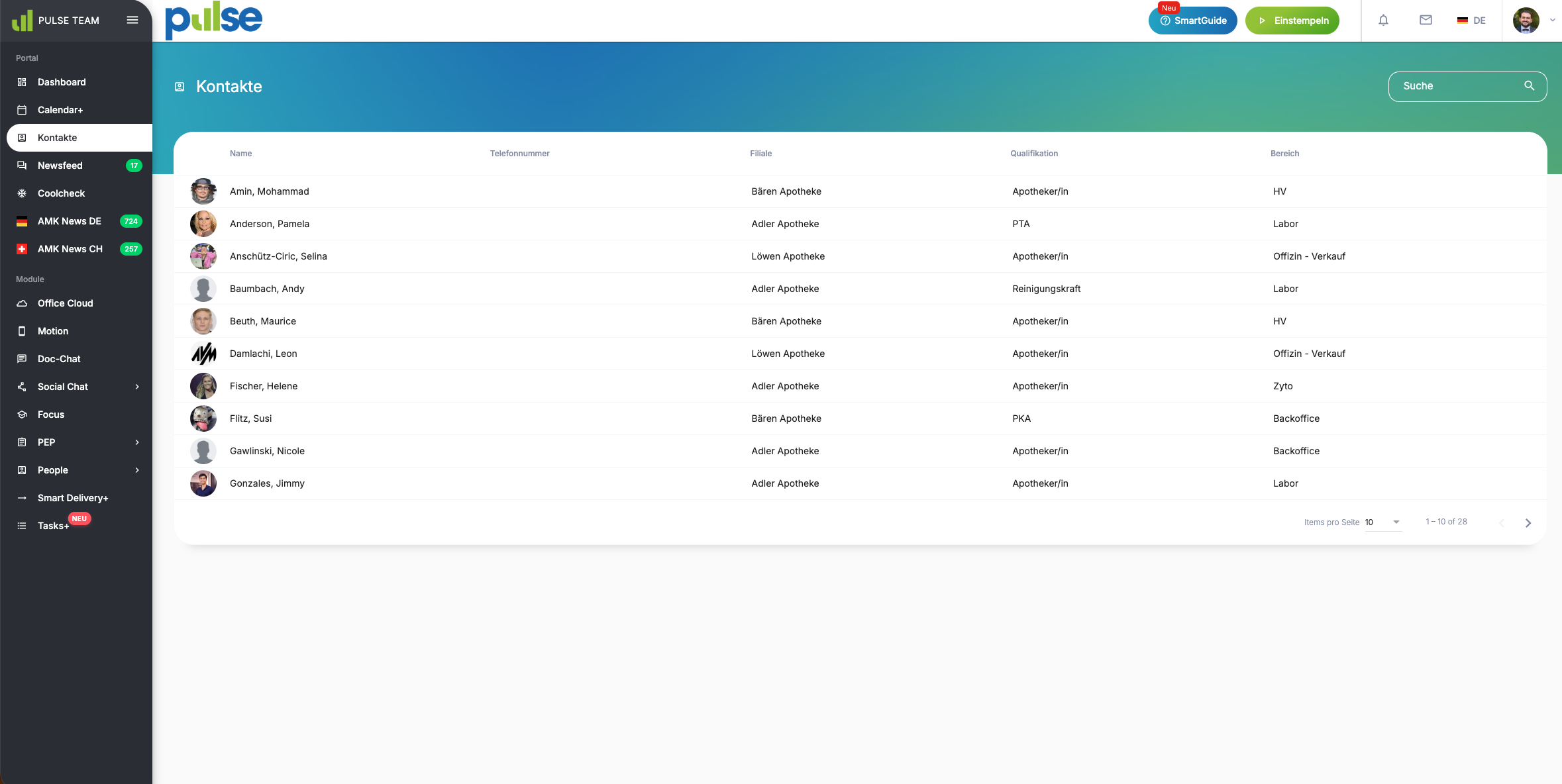 Das Menü „Kontakte“ bietet eine zentrale Übersicht aller Benutzer, die in Ihrem PULSE Portal hinterlegt sind.